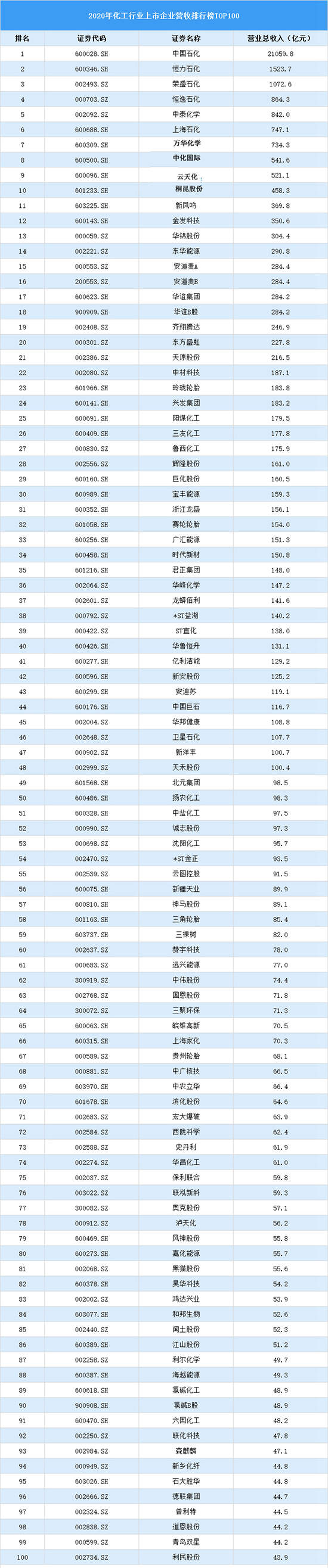 以下为2020年化工行业上市公司营业收入前100名。