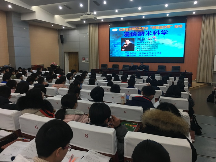 2019年1月27日上午,由江苏省化学化工学会主办的科普进校园活动在中华中学举行,邀请了国家杰出青年基金获得者、教育部长江学者特聘教授,南京大学化学化工学院胡征教授作了题为“漫谈纳米科学”的科普报告。胡征教授结合自己从事的能源纳米材料物理化学研究工作,特别是结合有关纳米碳材料的研究,给同学们介绍了纳米领域兴起的背景、若干重要进展经及神奇的纳米世界,从而激发学生对科学探索的兴趣和激情。全省20余所中学300余名学生聆听了科普报告,受到了学生的热烈欢迎。