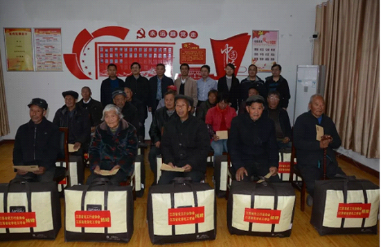 捐赠仪式结束后,省化学化工学会秘书处全体党员来到后荡村,向老党员、军烈属、老支书和困难群众代表赠送了过冬棉被和慰问金。